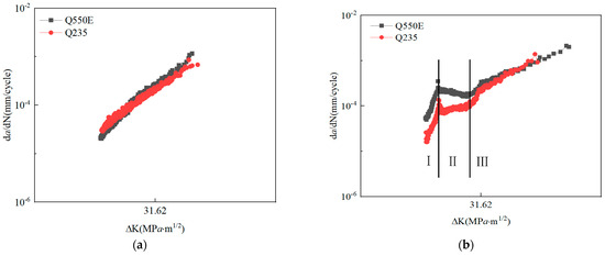 Figure 7 shows the crack growth rates of the two steels according to their average values, and an intersection point at a stress intensity factor amplitude of 24.04 can be observed. After this point, the crack growth rate of Q550E is slightly higher than that of Q235. As shown in this figure, the crack growth rates of the corroded specimens can be roughly divided into three stages in the logarithmic coordinate system, i.e., Stage I of initial crack growth, Stage II of the crack passing through the pit, and Stage III of stable crack growth. When the crack growth length reaches 12 mm, the crack reaches the edge of the corrosion pit, and the crack growth rate then suddenly changes and enters Stage II. When the crack length reaches 16mm, the crack propagation completely passes through the corrosion pit, and the crack propagation of the specimen reaches a stable stage. The fatigue crack propagation rate is linearly related to the stress intensity factor in the logarithmic coordinate system. The crack growth rate of Q550E in Zones I and II is significantly higher than that of Q235. Once the crack propagates through the corrosion pit, the crack propagation rate of Q550E is slightly higher.