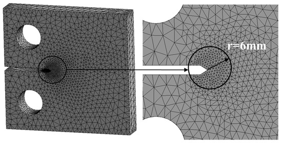 A finite element model was developed by using the commercial software ANSYS workbench. The specimen size, material parameters, and load of the finite element model were consistent with those of the crack propagation test. A tetrahedral mesh and Solid185 elements were adopted, and the overall mesh accuracy was set to 1.5 mm. For a more realistic simulation and considering the requirements of time and accuracy, an influence ball with a radius of 6 mm and a mesh precision of 0.4 mm was set at the crack tip for mesh refinement, as shown in Figure 8. Smart crack growth simulation was adopted in the mesh processing. This process is based on mesh division that simulates the features of fatigue or crack growth morphology in engineering structures, representing separation, deformation, adaptation, and re-division technology. To simulate static or dynamic fatigue crack growth in the solution process, the influence of the crack tip stress singularity on the crack growth rate can be effectively alleviated. Because the grid changes occur at the crack front, the stress state at the crack tip can be well represented in the process of crack propagation, and the high stress intensity factor at the crack tip caused by rough grid division can be avoided.