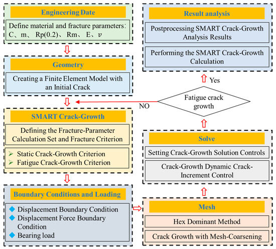 The X-axis in the FEM indicates the direction of crack propagation, and the Y-axis indicates the crack opening direction. The upper loading hole was divided into upper and lower sides and coupled to the centre for loading. The displacement in the X and Z directions and the rotation in the X and Y directions were fixed at 0. The lower loading hole was coupled with the force, where the displacement in the X, Y, and Z directions and the rotation in the X and Y directions were constrained. The process for developing the finite element model is shown in Figure 9.