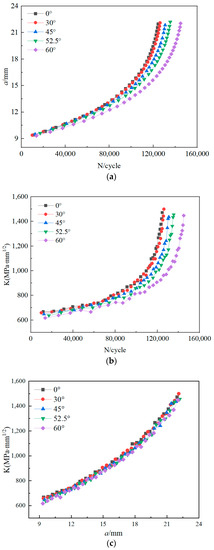 As shown in Figure 11, the trends of crack propagation at different angles were the same. The curves are very close to each other when the initial angles are in the range of 0°–45°, but they change significantly at 60°. Thus, there is a critical angle of crack propagation. An encrypted approximation at 45°–60° was carried out. It was found that the critical angle was 52.5°, where the crack growth rate suddenly changed. According to the K–N curve, with an increase in the initial crack propagation angle, the stress intensity factor caused by crack tip fracture decreases, and the reduction range is as high as 59%. Therefore, an initial crack angle of 0° is the most unfavourable for crack propagation. The initial crack angle has little effect on the K–a relationship.