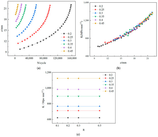 Influence of the crack depth ratio: (a) a–N; (b) K–a; (c) K–R.