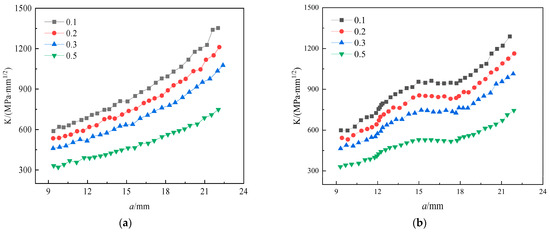 As shown in Figure 14, whether the steel is corroded or not, the stress ratio is directly proportional to the crack length and inversely proportional to the stress intensity factor. The curves of corroded specimens fluctuated and experienced a sharp–slow–sharp growth process. This is because the effective length of the crack tip decreases when the crack propagation length is about to reach the corrosion pit. This leads to a sudden increase in crack tip stress and, in turn, to a sudden change in the crack propagation rate.