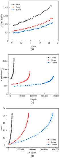Crack propagation with different thicknesses: (a) K–a; (b) K–N; (c) a–N.