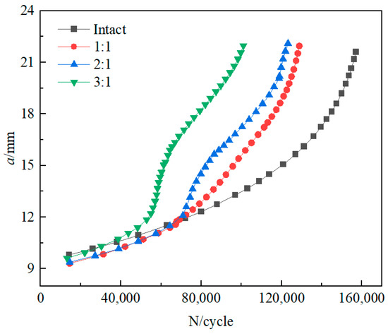As shown in Figure 16, before the crack propagation length reaches 12 mm, the corrosion pits do not affect the fatigue life. Then, when the front line of the crack reaches the edge of the pit, the crack propagation rate begins to increase slowly. When the crack propagation length reaches 16 mm, that is, the crack passes through the bottom of the pit, the crack propagation rate increases significantly. Therefore, the corrosion pit has little effect on the crack propagation in the early stage of the corrosion pit (less than 12 mm), and the fatigue life of the specimen is obviously different when the crack passes through the corrosion pit. The maximum difference in fatigue life was 29,252 times when passing through the corrosion pit, accounting for 19% of the total life.