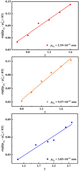 In view of the above-indicated situation, it is an expedient approach to deduce the functional relations between and y separately at each experimental oxygen partial pressure. It was assumed that the relations between and y could be expressed by the relation shown in Equation (13).