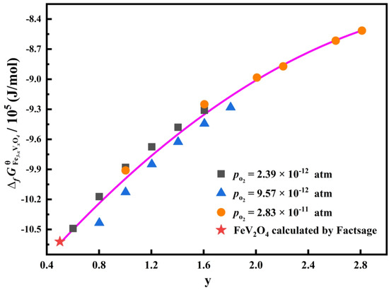 From the calculated results of shown in the last column of Table 3, it can be found that both the Fe/V molar ratio of Fe3–xVxO4 and the equilibrating oxygen partial pressure have a significant effect on the chemical potential of Fe in the Fe3–xVxO4 compound. At each fixed oxygen partial pressure, the chemical potential of Fe increased gradually with the increase of the Fe/V molar ratio. By comparing the results with the same Fe/V ratio, it can be found that the chemical potential of Fe decreased gradually with the increase of the equilibrating oxygen partial pressures. For instance, the for Fe3–xVxO4(Fe/V = 1.6) decreased from −23,861.3 J/mol to −28,362.0 J/mol and then to −37,547.4 J/mol, while the oxygen partial pressure increased from 2.39 × 10−12 atm to 9.57 × 10−12 atm and then to 3.83 × 10−11 atm.