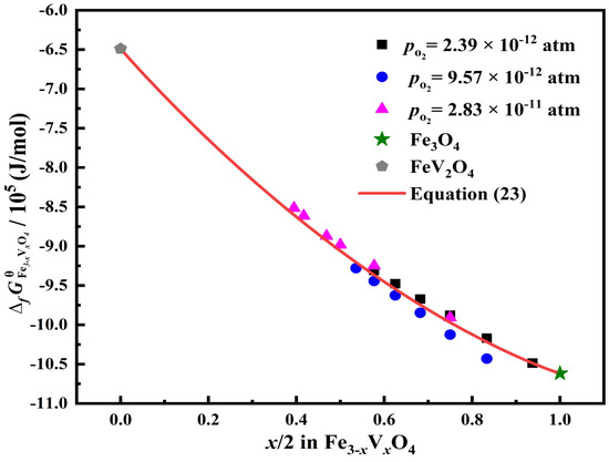 Now, by inserting the values of and presented in Table 4 into Equation (21), the standard Gibbs energy of formation of Fe3–xVxO4 with different Fe/V ratios under experimental oxygen partial pressures was calculated, and the calculated results are listed in Table 6.