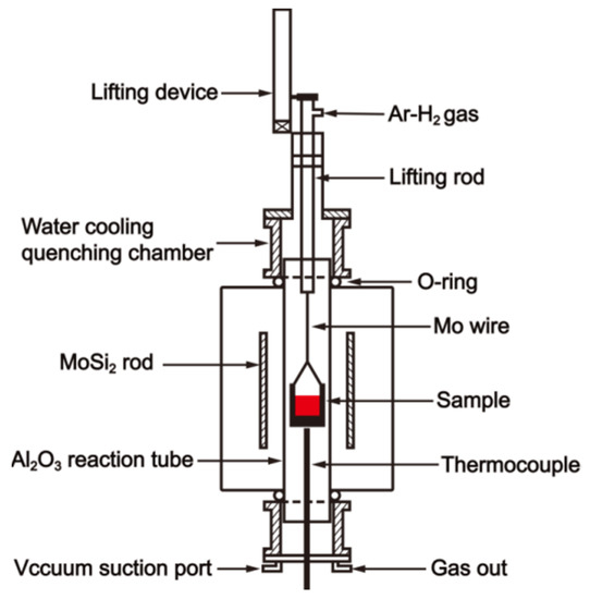 - After 2 h, the sample was lifted into the water-cooled quenching chamber for about 1.5 s by the lifting device mainly consisted of a high-speed motor, and then quenched with high-flow rate argon gas for 10 min. Subsequently, the metal phase was carefully separated, and the surface of the metal was ground off by 2 mm.