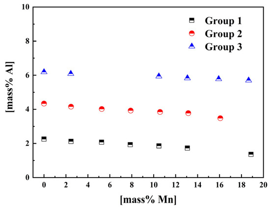 The experimental results are shown in Table 1, which show that the flux composition changed little before and after equilibrium, and the flux composition of each group was very close. It should be noted that each experiment was repeated multiple times. The difference between the measurement results of Mn and Al with the same initial content of the melt after equilibrium is within 10%. Additionally, Figure 3 shows the influence of Mn content in melt on Al content in the Al2O3 saturated Fe-Mn-Al-O melts. It can be clearly seen from the figure that the Al content decreases with the increase in Mn content in Fe-Mn-Al-O melts in the same group. This result indicates that although the Al content does not change significantly with the increase in Mn content, the interaction parameters between Mn and Al cannot be neglected.