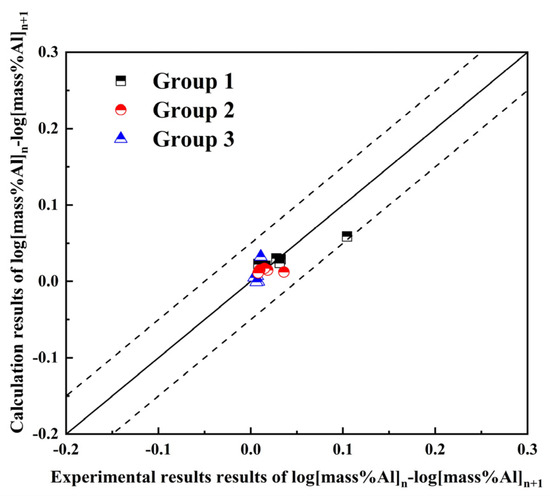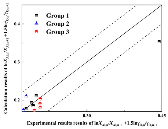 where n represents the experiment number in each group. is the mass fraction of the components. and are the activity coefficient of Al and O, respectively. The expressions for and can be expressed as Equation (4), shown as follows: