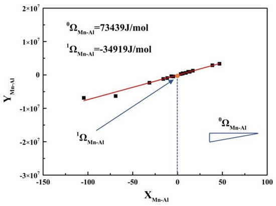 - The binary interaction parameters between Al and Mn, , and were determined to be 73,439 J/mol and −34,919 J/mol, respectively, calculated by the R-K polynomial.