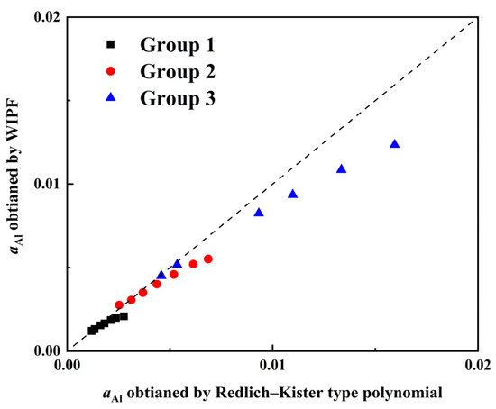 The Al activity calculated using the WIPF (standard state of 1% concentration) can be converted to the Al activity with pure substance as the standard state (R-K polynomial) using the relationship shown as Equation (18). Then, the comparison of the Al activities calculated by the R-K polynomial and WIPF using the experiment data can be obtained, as shown in Figure 9. It should be noted that the negative values in Figure 9 do not have actual meaning, they are aimed to present data points closer to 0 more clearly.