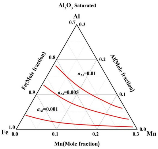 Adopting the R-K polynomial and its parameters obtained in this study, the iso-activity contours of Al were calculated as shown in Figure 10. It can be seen from the figure that the activities of Al increase with increasing Al content. Additionally, the activity coefficients of Al with different contents are less than unity, which indicates that Al in the Fe-Mn-Al-O system shows a negative deviation from the ideal solution. Moreover, it can also be deduced from Figure 10 that the Al activity is affected by the Fe/Mn molar ratio of the melts, and it decreases with the increasing of the Fe/Mn molar ratio. Accordingly, the Al activity increases with the increase in Mn content. Thus, an increase in Mn content will promote the reaction of Equation (1).