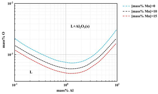 In order to further evaluate the influence of the Mn addition on the formation of Al2O3 inclusions, the Al-O equilibrium behavior in Fe-Mn-Al-O melts at different Mn contents was studied. Substituting Equation (4) into Equation (2), the Al-O equilibrium curve can be calculated using the WIPF and the interaction parameters obtained in the present study, as shown in Figure 11. The coordinate axes represent the content of Al and O, respectively, and are expressed in exponential form. The value of K has been obtained in previous study [28]. It can be seen from the figure that with the increase in Mn content, the equilibrium O content at the same Al content was reduced. Correspondingly, the Al2O3 saturation region was expanded. This result indicates that when smelting high Mn and Al content steel, stricter control of O content in steel is needed to reduce the generation of Al2O3 inclusion.