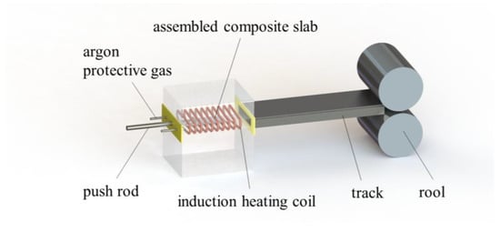 The assembled composite plate was placed in an intermediate frequency induction heating device, and induction heating was used to quickly heat ferromagnetic materials. Carbon steel was quickly and evenly heated until reaching the magnetic transformation point []. The melting point of pure aluminum is 630 °C, which is lower than the temperature at the magnetic transformation point of carbon steel. During heating, carbon steel came into contact with pure aluminum, so pure aluminum could be heated to a molten state through heat transfer. There were two stainless steel gaskets with poor thermal conductivity between pure aluminum and aluminum alloy, which could avoid direct-contact heat transfer between pure aluminum and aluminum alloy and ensure that the temperature of the aluminum alloy increased slowly within a short period. The schematic diagram of carbon-steel/pure-aluminum/aluminum-alloy composite plate prepared by induction heating is shown in Figure 2. To prevent oxidation during heating, the induction heating device and the rail were sealed, and protective argon gas was continuously introduced into the induction heating device during the heating process.