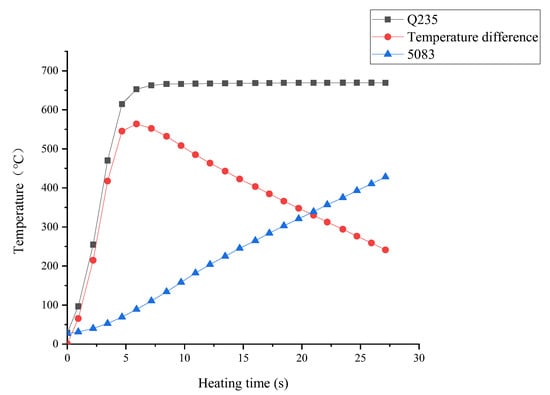 The temperature of the assembled composite plate was controlled by adjusting the induction heating time. A K-type thermocouple was used to measure the temperature at the center of carbon steel and aluminum alloy. The temperature change of carbon steel and aluminum alloy under 30 kW intermediate frequency induction heating is shown in Figure 3. The induction heating frequency was 2500 Hz. The heating time was set to 10 s, 15 s, 18 s, 20 s and 25 s by comprehensively considering the aluminum-alloy temperature and pure-aluminum melting time.