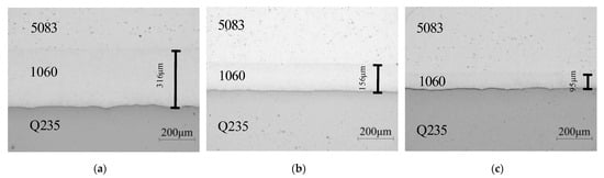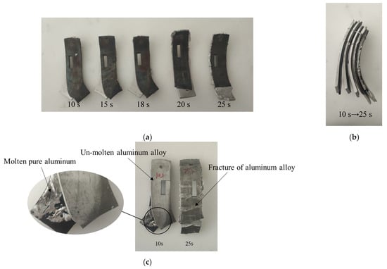 The rolled carbon-steel/pure-aluminum/aluminum-alloy composite plates under different induction heating times are shown in Figure 5. The composite plates had good bonding under an induction heating time of 10–18 s. There was no phenomenon of separation between carbon steel and aluminum alloy after rolling, as shown in Figure 5a. The plate tail became separated because there were no lateral constraints resulting from the distance limitation of the guide rail when entering the roller and processing error. The elongations of the steel and the aluminum alloy after rolling were the same under the heating time of 10–18 s, so coordinated deformation was achieved through the differential temperature rolling. With the heating time increase to 20–25 s, as the temperature of the aluminum alloy increased, the deformation resistance of the aluminum alloy decreased, making the elongation of the aluminum alloy greater than that of steel. Under the heating time of 10 s, as shown in Figure 5b, the composite plate was relatively straight. With the increase in heating time, the temperature difference between steel and aluminum alloy decreased, and the difference in deformation resistance between the two, as well as the bending degree of the composite plate toward the steel, increased. As shown in Figure 5c, in the rolling process, the pure-aluminum interlayer melted under the heating time of 10 s, so under longer heating times, the pure aluminum also melted. When the heating time reached 25 s, the temperature of aluminum alloy was close to the melting point of aluminum alloy. After rolling, a lot of cracks emerged on the edge of the aluminum alloy, and the aluminum alloy broke itself.