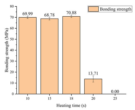 After the rolling process was completed, the wire cutting was used for sampling in the front and middle of the composite plate in the rolling direction, and the shear strength was tested by processing the shear specimen. The interfacial shear strength of carbon-steel/pure-aluminum/aluminum-alloy composite plates under different induction heating times is displayed in Figure 6. It can be seen that when the heating time was 10–18 s, the shear strength of carbon-steel/pure-aluminum/aluminum-alloy composite plates could reach more than 68 MPa, and the interface shear fracture at this point is shown in Figure 7. It can be seen that the shear fracture occurred on the pure aluminum interlayer, a part of pure aluminum adhered to the carbon steel, and there was an included angle of 10–15° between the pure-aluminum fracture surface and the steel–aluminum bonding surface. The reason is that during the heating process, pure aluminum gradually becomes liquefied; due to the rolling force and high temperature at the interface between carbon steel and pure aluminum, steel and aluminum elements have great diffusion, and the strength of pure aluminum near the interface increases and is already greater than that of pure aluminum, thus the fracture occurs inside the pure aluminum. Therefore, when the induction heating time was 10–18 s, the bonding strength of carbon-steel/pure-aluminum/aluminum-alloy composite plates reached the limit, i.e., the lowest strength of pure aluminum. When the heating time reached 20 s, the bonding strength of the composite plate sharply declined to 13.7 MPa. The specific reasons for this phenomenon will be further analyzed through subsequent microstructure characterization. When the heating time reached 25 s, the bonding strength could not be measured for the cracks emerged in the aluminum alloy.