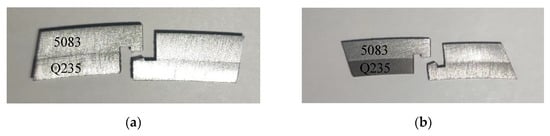 In the rolling experiment, Q235 carbon steel ( ) (120 × 40 × 5 mm3) was selected as the base layer, 5083 aluminum alloy (120 × 40 × 5 mm3) as the cladding layer, and 1060 pure aluminum (120 × 40 × 0.5 mm3) as the interlayer. The chemical compositions of Q235B steel, 5083 aluminum alloy, and 1060 pure aluminum are shown in Table 1.