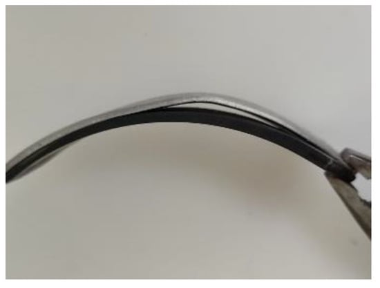 The steel/aluminum-alloy composite plate without the pure aluminum interlayer after rolling is shown in Figure 8. The head of the composite plate was tightly attached due to the action of the stainless steel rivet, and the aluminum matrix in the middle of the composite plate protruded outward and separated from the steel matrix, in which case the steel/aluminum-alloy composite plate could not be effectively bonded. It is believed that the bonding strength of the steel/aluminum-alloy composite plate in this state is 0 MPa. The primary reason is the direct heat transmission from the steel plate to the aluminum alloy, which causes the rapid rise of temperature of the aluminum alloy in the absence of a pure-aluminum interlayer. In this instance, the deformation resistance of aluminum alloy is far weaker than that of steel, so deformation is seriously inconsistent during rolling. In the rolling area, the forward sliding deformation of aluminum is far greater than that of steel. When the accumulated deformation of aluminum in the front area of rolling reaches a certain level, the shear stress caused by forward sliding will be greater than the interfacial shear strength and thus the bonding interface will be cracked. When the tail area of the plate was rolled, due to the crack in the middle area of the plate, the interfacial shear stress is released, and the interfacial shear stress in the tail area was reduced, so the steel and aluminum alloy at the tail area were bonded together.