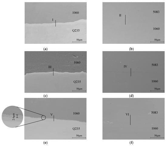 The bonding interface under an optical microscope is shown in Figure 9. The interfaces between carbon steel, pure aluminum, and aluminum alloy could be clearly distinguished. The thickness of the pure aluminum interlayer decreased with the increase in heating time. The thicknesses of the 1060 layer were 316 μm, 156 μm, and 95 μm at heating times of 10 s, 18 s, and 20 s, respectively. The reason for the changes in thickness is that as the heating time increases, the temperature difference between pure aluminum and aluminum alloy decreases, and the temperature drop of pure aluminum declines during contact, making it more prone to deformation. The SEM images of the bonding interface under different induction heating times are displayed in Figure 10. Under heating times of 10 s and 18 s, there were no obvious rolling defects at the bonding interface, and the interfaces of carbon steel/pure aluminum and pure aluminum/aluminum alloy were both distinct without any obvious compounds, as shown in Figure 10a–d. When the heating time was 20 s, compounds emerged at the interface of carbon steel/pure aluminum, as shown in Figure 10e. In the SEM image of the pure-aluminum/aluminum-alloy interface, the pure-aluminum/aluminum-alloy interface was no longer distinguishable, as shown in Figure 10f. The element line-scan images of different bonding interfaces are shown in Figure 11. It can be seen that there was a small peak of magnesium at the pure-aluminum/aluminum-alloy interface, where magnesium accumulated and diffused towards the pure-aluminum interlayer. In the line scan of the carbon-steel/aluminum-alloy interface under a heating time of 15 s, steel/aluminum elements diffused mutually to form a 0.83 μm thick diffusion layer. In the line scan of the carbon-steel/aluminum-alloy interface under a heating time of 18 s, the thickness of the diffusion layer increased with heating time, ultimately forming a 0.99 μm thick diffusion layer, without compound formation at the interface. When the heating time was 20 s, the mutual diffusion between elements became intense as the heating time increased, and a compound was formed when the concentration of the two elements reached a certain level. In the element line scan of the carbon-steel/aluminum-alloy interface under a heating time of 20 s, the steel and aluminum elements formed a clear plateau, indicating that a compound layer with a thickness of 2.6 μm was formed here.