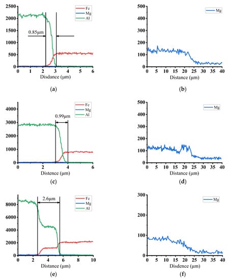 Line-scan images of different bonding interfaces under different induction heating times: (a) carbon-steel/aluminum-alloy interface, 10 s; (b) pure-aluminum/aluminum-alloy interface, 10 s; (c) carbon-steel/aluminum-alloy interface, 18 s; (d) pure-aluminum/aluminum-alloy interface, 18 s; (e) carbon-steel/aluminum-alloy interface, 20 s; and (f) pure-aluminum/aluminum-alloy interface, 20 s.