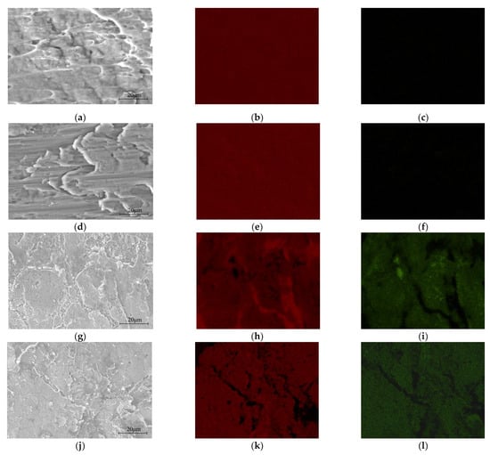 An element surface scan was performed on the fracture surface of shear specimens under an induction heating time of 18 s and 20 s. The morphology of the shear fracture and EDS surface scan under different heating times are shown in Figure 12. When the heating time was 18 s, the shear fracture exhibited a ductile fracture, and Al dominated (99%) on both the steel and aluminum sides, while Fe was almost invisible, indicating that the fracture occurred on the pure aluminum interlayer under this heating time. When the heating time was 20 s, as shown in Figure 12g–l, a large number of brittle fractures were observed in the SEM images, as well as much Fe and Al in the EDS surface scan, indicating the generation of a large number of compounds under this temperature. So compared to the bonding strength of the composite plates, which were heated for 10–18 s, the bonding strength of the composite plate heated for 20 s decreased significantly.
