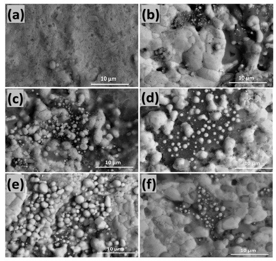 SEM images of the examined samples: (a) the microstructural characterization of the pure copper, (b) mono-composite 5% Cu-B4C, (c) mono-composite Cu/5% Si3N4, (d) hybrid composite Cu/2.5% B4C + 2.5% Si3N4, (e) hybrid composite Cu/5%B4C + 2.5%Si3N4, and (f) hybrid composite Cu/2.5% B4C + 5%Si3N4.