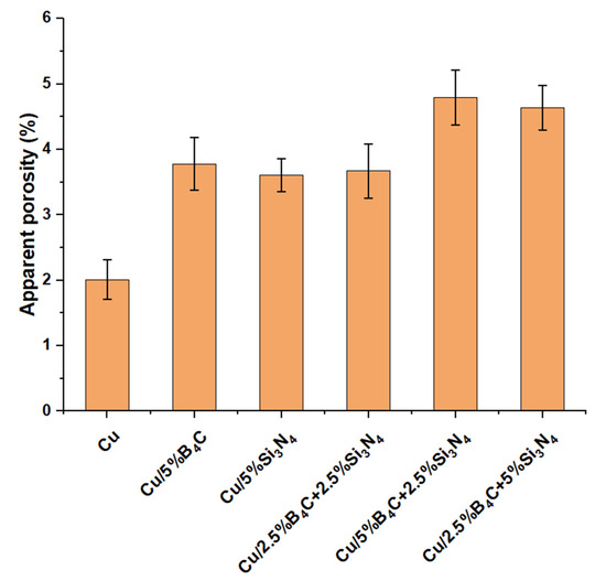 Figure 4 shows that the base alloy had the lowest apparent porosity of all the investigated samples. The base alloy has a relatively uniform structure with few defects or voids. However, when reinforcement particles were added, the apparent porosity increased. The reinforcement particles distribute the material’s structure, creating more space. The error bars in the apparent porosity and the bulk density of the investigated samples represent the uncertainty in the measurement. This uncertainty can be caused by many factors, such as the accuracy of the equipment used to measure the porosity, the variation in the sample size, and the variability of the material itself.