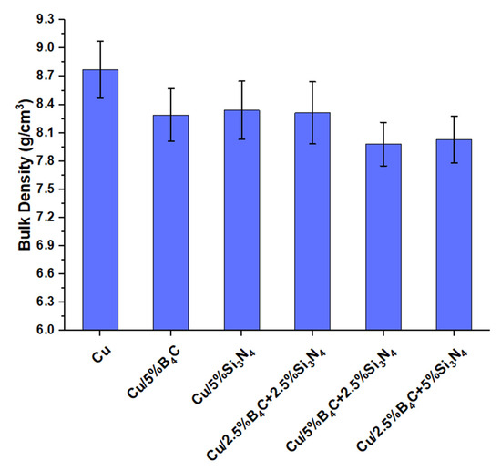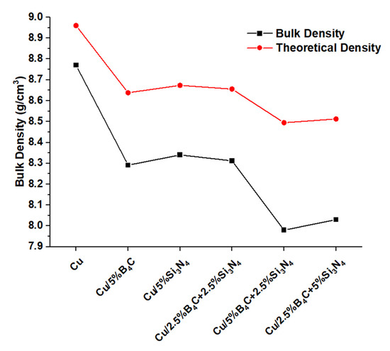 It is evident that the incorporation of 5% of B4C in the mono-composite specimens resulted in a 5.5% increase in bulk density. Similarly, adding 5 volume percent of Si3N4 led to a 4.9% enhancement in bulk density. Conversely, incorporating hybrid composites comprising 2.5% of B4C and 2.5% of Si3N4 has yielded outcomes almost comparable to those of the mono-composite with a 5.2% enhancement. Adding 5% of B4C and 2.5 vol % of Si3N4 has yielded the most significant improvement results, resulting in a 9% reduction in bulk density. Altering the composition to include 2.5% of B4C and 5% of Si3N4 has resulted in superior outcomes compared to the mono-composite, with an 8.4% improvement in bulk density. Incorporating hybrid nanocomposites containing 5% of B4C and 2.5% of Si3N4 has yielded the most favorable outcomes, as evidenced by a 9% increase in bulk density. As depicted in Figure 6 and delineated in Table 2, it is evident that the variance between the bulk and theoretical density is negligible, exhibiting a 2.1% dissimilarity in Cu and 6.1% in Cu, 5% B4C + 2.5% Si3N4. This is the reason why the bulk density decreases with the increase in B4C at a fixed percentage of Si3N4 in a copper base metal reinforced with Si3N4 and B4C.