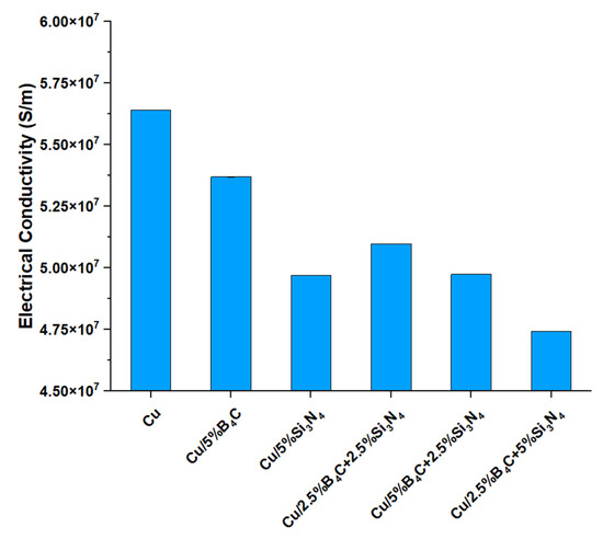 The exceptional electrical conductivity of pure copper has made it a popular choice for various electrical and electronic applications. The practical applications of pure copper are limited in certain fields due to its low microhardness and poor wear resistance. To solve these problems, the amount of B4C and Si3N4 particles is the most important factor that controls the overall properties of the composite. The results showed that adding B4C and Si3N4 particles made the pure copper matrix composite less conductive. However, the decrease in electrical conductivity was minimal for low-loading fractions of the reinforcing particles. Also, the study found that as the amount of B4C particles increased, the composite’s ability to conduct electricity decreased, which is in line with [42]. Based on these results, adding B4C and Si3N4 particles to a pure copper matrix composite may make the microhardness and mechanical properties of the composite better, but it may also make the composite less good at conducting electricity. Optimizing the amount and size of the reinforcing particles facilitates striking a balance between electrical conductivity and improving mechanical properties. From the previous results, the B4C and Si3N4 particles reduced the electrical conductivity by 4.8% and 11.9%, respectively; thus, the results revealed that the current investigation improved the electrical conductivity compared with the previous studies. In a study by Singh et al., they found that incorporating hybrid ceramic reinforcement particles and B4C with 5% v contents into a copper matrix reduced the electrical conductivity by 62% with respect to the copper base matrix [43]. As shown in Figure 7, the 2.5% vol. of the hybrid B4C and Si3N4 particles results in minor losses in the electrical conductivity compared with the other hybrid percentage ratios.