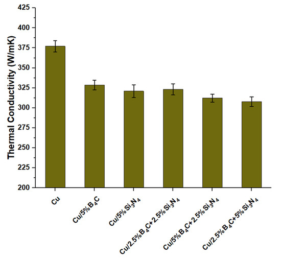 Furthermore, adding ceramic particles to copper may reduce ductility and ultimate tensile strength due to the inherent brittleness of the ceramic particles. Therefore, the optimal concentration and distribution of ceramic particles must be carefully considered to achieve the desired balance between thermal properties and mechanical performance. In addition, it should be noted that the particle size may adversely affect the composites’ thermal conductivity. Although the reduction in the thermal conductivity is minor, as shown in Figure 8, the hybrid Cu/2.5% B4C + 2.5% Si3N4 achieved the optimum ceramic percentage to enhance the thermal conductivity without decreasing the mechanical properties.