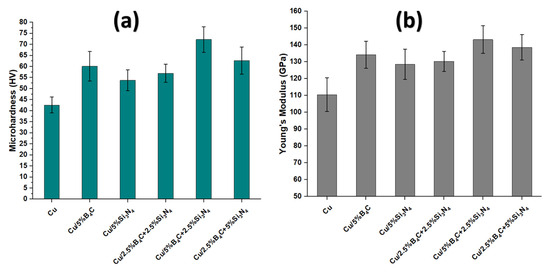 - The hybrid composite of copper reinforced with 5% boron carbide and 2.5% silicon nitride showed a significant increase of 32% in Young’s modulus and a substantial improvement of 71% in microhardness compared to the pure base metal.