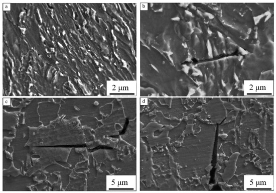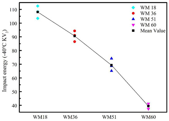 - With the increase in Si content from 0.18 wt.% to 0.36, 0.51 wt.%, and 0.60 wt.%, the impact energy decreased monotonously, and its average value decreased from 108.1 J to 90.6 J, 69.3 J, and 39.4 J, respectively. Considering that the impact toughness of 500 MPa weathering bridge steel joints needs to be higher than the limit of 54 J, to ensure good toughness of the weld metals, doping of Si in weld metals should not exceed 0.51 wt.%;