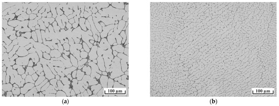 The as-cast Al, Al4Si, and Al1Ca alloys were treated using PEO technology. The hypoeutectic Al4Si and Al1Ca alloys (Figure 1) consisted of α-Al dendritic cells surrounded by eutectic structures (((Al) + (Si)) and ((Al) + Al4Ca), respectively). However, the dendritic cells of the Al–Ca alloy had smaller sizes. The actual chemical compositions of the alloys summarized in Table 1 were quite close to the nominal one. The microstructures of those alloys contained similar volume fractions of the eutectic phases formed during solidification, i.e., about 3 vol.%. Moreover, it is worth mentioning that a comparable volume fraction of the second phase in the Al–Ca alloy was achieved at a significantly lower concentration of the main alloying component.