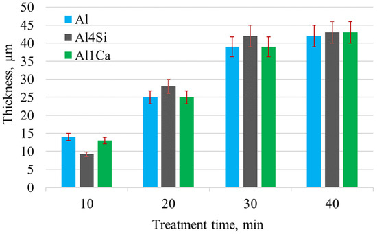 Figure 2 shows the thicknesses of coatings on pure aluminum and the eutectic Al–Si and Al–Ca alloys for different PEO treatment durations. Both the Al and Al–Ca samples exhibited similar coating growth rates within the first 30 min, and then the growth rates decreased. Similar behavior was observed for the Al–Si system alloy. However, a characteristic feature of the Al–Si alloy is a low PEO coating growth rate in the first 10 min of the process. The coatings grew to almost similar thicknesses of about 39–42 μm after 30 min PEO treatment for all the samples.