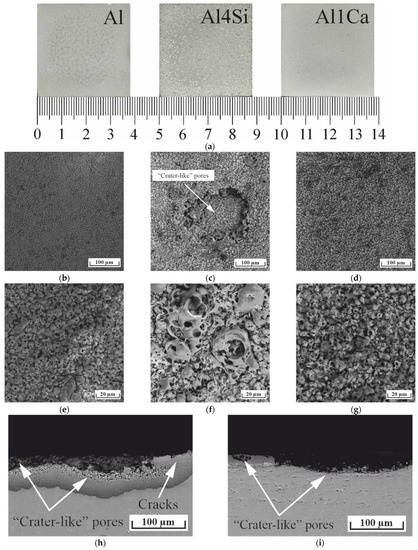 The appearance of the coatings on the aluminum substrates after 30 min of PEO treatment is shown in Figure 3a. Figure 3b–g shows typical top-view micrographs of the outer coating layer. The coatings grown on pure aluminum and the Al1Ca alloy had the highest uniformity. As for the Al–Si system alloy, the morphology of the as-grown coating appeared to be coarser. Figure 3c shows that the “crater-like” pores in the coating formed on the Al–Si alloy can be as large as 200 microns. Stylus-based surface profiling of pores in the external PEO layers of the Al–Si alloy showed that the average depth of the pores was 23 to 33 μm, with their diameter being about 200 μm. Typical defects (cracks and “crater-like” pores) of the PEO coatings synthesized on the Al4Si alloy (cross-section view) are shown in Figure 3h,i.