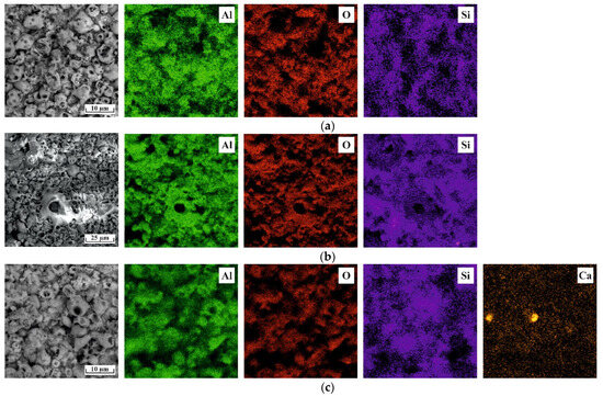 EDS distribution maps for the surfaces of the PEO coatings: (a) Al, (b) Al4Si, and (c) Al1Ca.