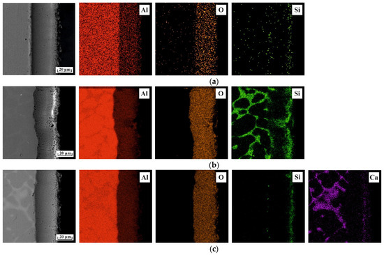 Cross-sectional element distribution maps for PEO coatings formed on various aluminum substrates: (a) Al, (b) Al4Si, and (c) Al1Ca.