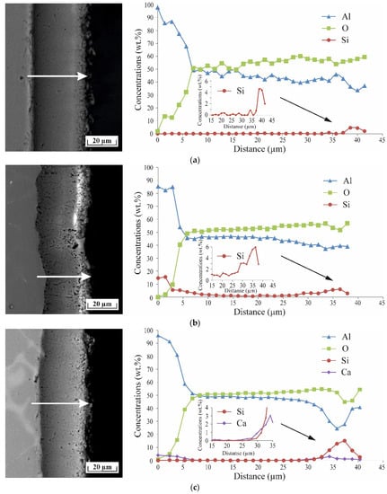 According to the element distribution map (Figure 5), Si was preferentially located in the top parts of the coatings. Probably, it was in the form of silicon dioxide formed as a result of the thermochemical treatment, during which the electrolyte surrounded the working electrode. According to the experimental results, the Si-containing region in the Al4Si specimen was significantly thicker than those for the Al and Al1Ca PEO coatings, due to the incorporation of Si-rich electrolyte species. A specific feature of the coating formed on the Al–Ca sample was the presence of a thin calcium-containing region in its top part.