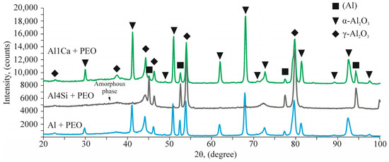 Based on the XRD data (Figure 7, Table 2), the PEO coatings on Al and the Al–Ca alloy mainly consisted of high-temperature α-Al2O3 modification and γ-Al2O3. The volume fractions of α-Al2O3 and γ-Al2O3 were about 60 and 30%, respectively. However, the elements migrating from the substrate had a great influence on the α-Al2O3/γ-Al2O3 ratio. For example, the coating formed on the Al4Si alloy consisted almost entirely of γ-Al2O3.