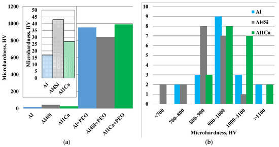(a) Average microhardness of alloys and PEO coating; (b) hardness distribution histogram at half-thickness of PEO coating.