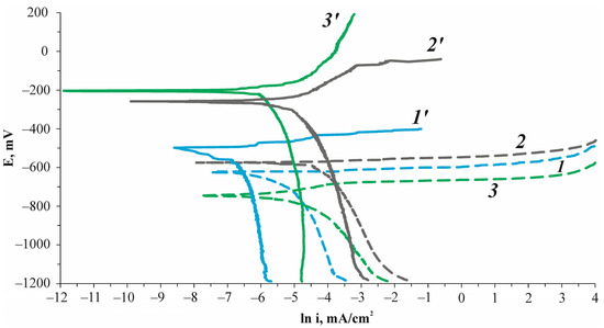 Polarization dependences of the current density, lni, on the potential E in 3.5% NaCl solution at a potential sweep rate of 1 mV/s for pure alloys (1) Al, (2) Al4Si, and (3) Al1Ca and for PEO-coated alloys (1′) Al, (2′) Al4Si, and (3′) Al1Ca. Potentials are shown relative to silver chloride electrode (Ag/AgCl).