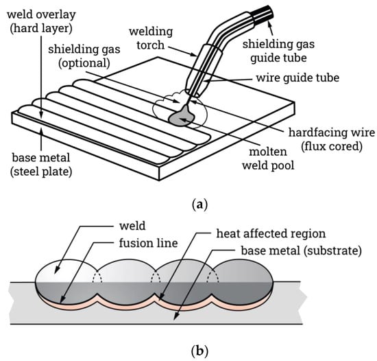 The practice of hardfacing has been a longstanding concept since World War II [2]. The concept was initially developed to improve the surface hardness of mining components to provide better wear resistance and reduce the downtime and maintenance costs. More recently, hardfacing has been widely applied as a surface improvement technique by various industries, including agriculture, nuclear plants, construction, manufacturing, and railways. Earlier studies on hardfacing suggest that this technique is prominently and widely used by industries, especially to improve various types of wear performance, like abrasion, galling, and erosion [1,3,4,5,6]. Likewise, improving a component’s resistance to impact and corrosion are other significant industrial applications of hardfacing. A few studies also show that this surfacing technique has potential in improving performance for kinetic projectile piercing [7,8,9,10].