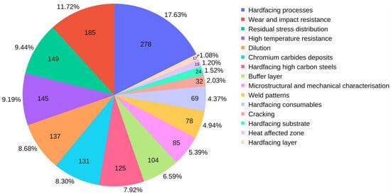 Initially, generic keywords, such as “hardfacing processes”, “hardfacing materials”, and “hardfacing applications” were used to search for the literature papers. Since this yielded over 3000 results, the search was filtered based on the title, abstract, and keywords of the papers; this resulted in a much better outcome. Fifteen distinct categories were then established, which formed the basis for organising the sections of this paper. Using each category as keywords, the literature papers were retrieved and placed in their respective category. However, it is important to note that a paper’s inclusion in a particular category does not imply exclusivity; it can also belong to other categories. The categorization is driven by the main idea or concept of the paper. Furthermore, the categories may not always match the exact keywords employed during the search. To refine the search results, sometimes multiple keywords using logical operators, such as AND, OR and parenthesis were used to establish specific relationships between the searched terms. Figure 2 presents all the categories, along with the corresponding number of the literature papers in each category. It is important to note that not all papers from the search are included in this review paper.