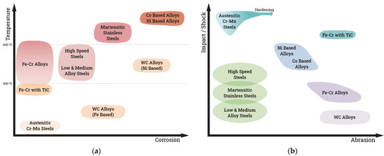 As suggested by prior research, high chromium iron-based alloys are the most common and economical alloys for abrasion resistance hardfacing [13,56], while nickel-based and cobalt-based alloys are suitable for wear and corrosion resistance hardfacing at high temperatures [57,58]. Figure 3 provides a general idea of different groups of consumables based on specific application requirements [1]. Standards and guidelines provided in relevant technical publications [50,59] should also be considered for optimal consumable selection.