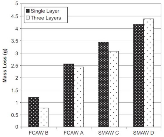 Mass loss due to wear in single- and three-layered iron-based hardface deposits produced by FCAW and SMAW. Reprinted with permission from Ref. [47]. Copyright 2023 Elsevier.