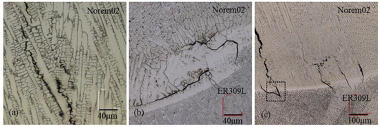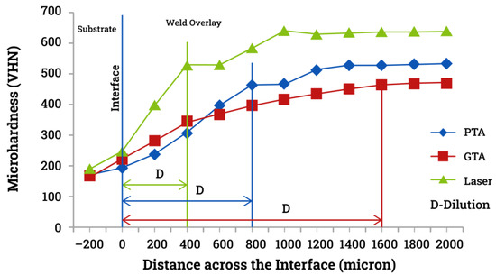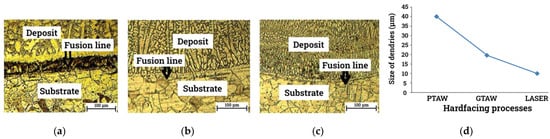 Comparative studies on GTAW, PTAW, and laser welding methods observed that the amount of dilution in the deposit was highest with GTAW process and least with laser cladding, recommending PTA and laser welding for lower dilution hardfacing [65,66]. The study also reported that the microstructures of the surface deposit and the substrate are also influenced by welding methods [65]. Figure 5 shows that the grain size of the deposit and the substrate near fusion line is smallest for laser cladding [65]. Similarly, another study on hardfacing by GTAW and cold metal transfer (CMT) welding disclosed that deposits made by CMT welding comparatively showed lower dilution and a smaller heat-affected zone (HAZ) [67]. Furthermore, a study using five different welding processes (SMAW, GMAW, GTAW, SAW, and PTAW) for boiler-grade steel hardfacing recommended PTAW for lower dilution and better weld quality [45]. The study suggests that welding method has a direct influence on the weld bead geometry and fusion area.