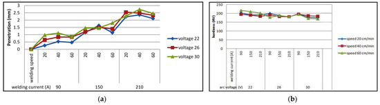 The effect of welding current on (a) penetration and (b) hardness at different arc voltage at 20 cm/min, 40 cm/min, and 60 cm/min welding speeds. Reprinted with permission from Ref. [72]. Copyright 2023 Elsevier.