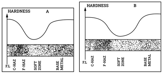 Hardness distribution in relation to the microstructure of HAZ for HSLA steel weldment at low heat input (A) and high heat input (B). Reprinted with permission from Ref. [79]. Copyright 2023 Elsevier.
